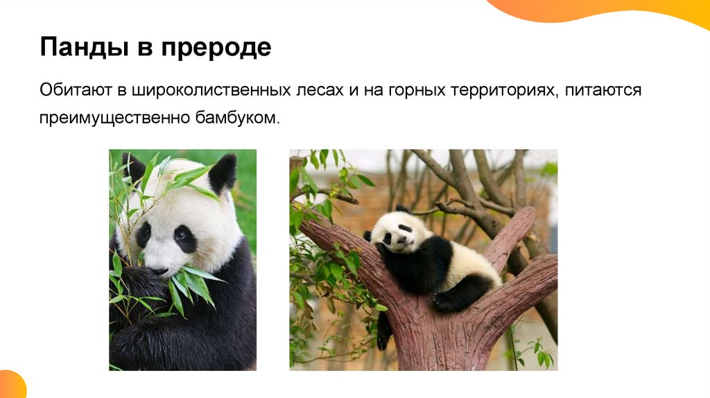 Панды в преродеОбитают в широколиственных лесах и на горных территориях, питаются