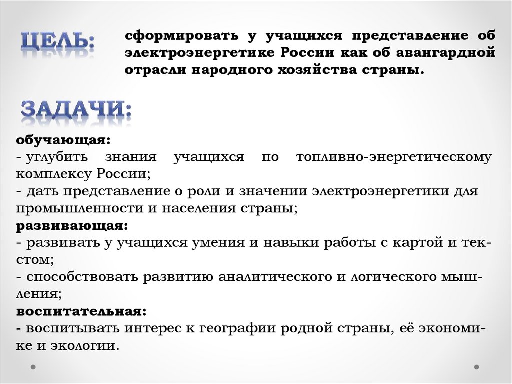 сформировать у учащихся представление обэлектроэнергетике России как об авангардной