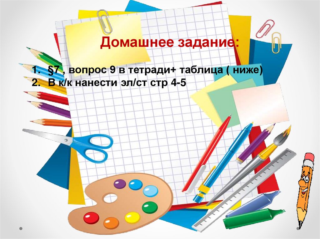 Домашнее задание:1. §7 , вопрос 9 в тетради+ таблица ( ниже)