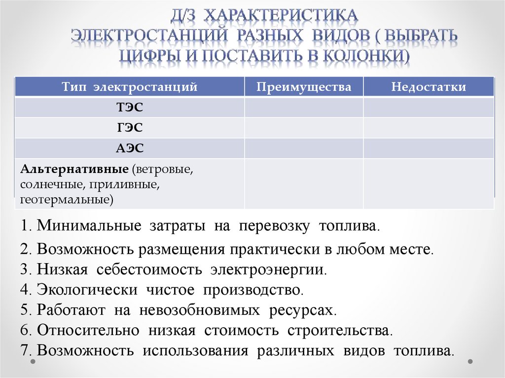 Тип электростанцийПреимущества