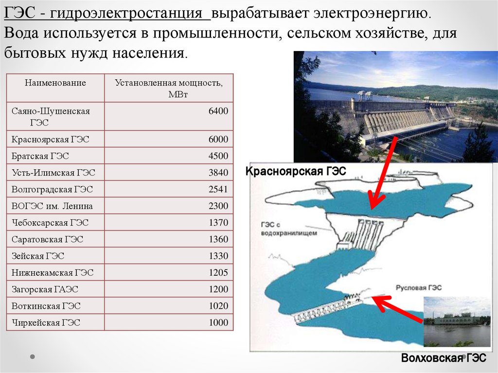 ГЭС - гидроэлектростанция вырабатывает электроэнергию.Вода используется в промышленности, сельском хозяйстве, для