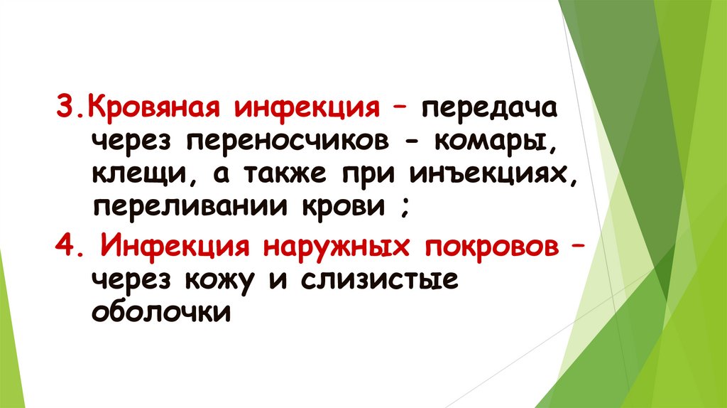 3.Кровяная инфекция – передачачерез переносчиков - комары,