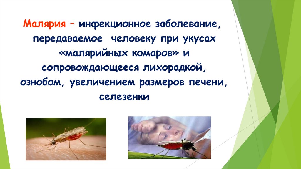 Малярия – инфекционное заболевание,передаваемое человеку при укусах