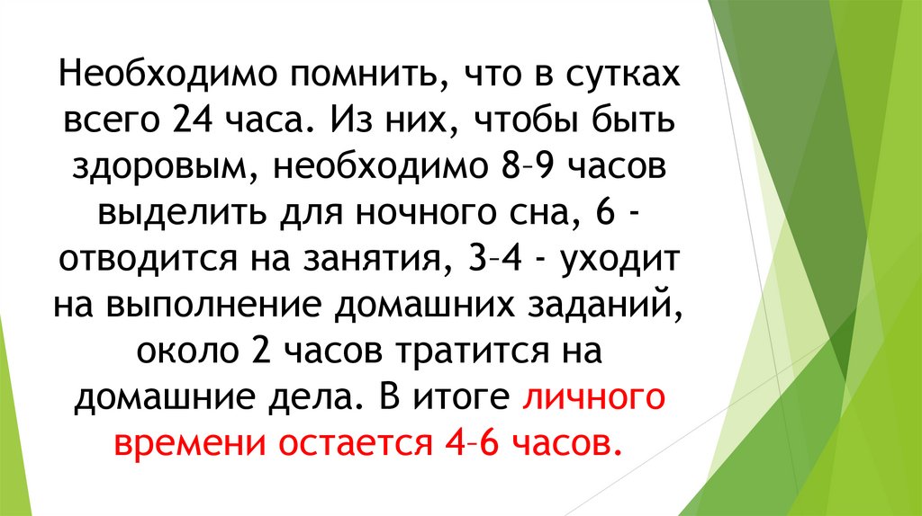 Необходимо помнить, что в суткахвсего 24 часа. Из них, чтобы быть