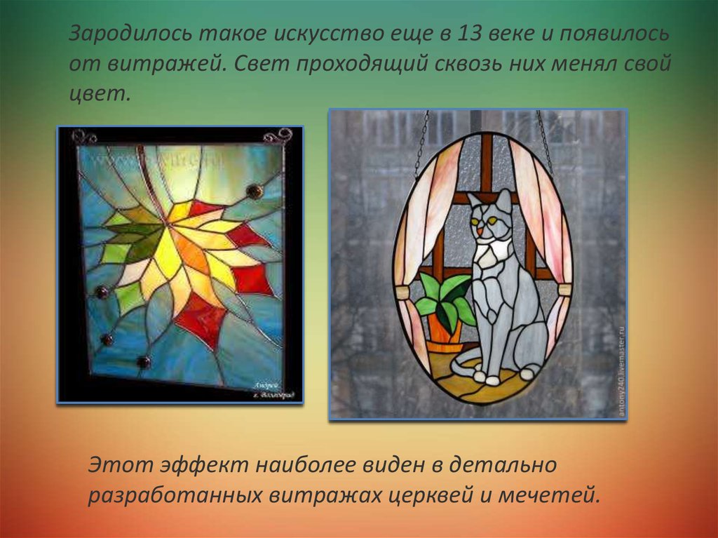 Зародилось такое искусство еще в 13 веке и появилосьот витражей. Свет проходящий сквозь них менял свой