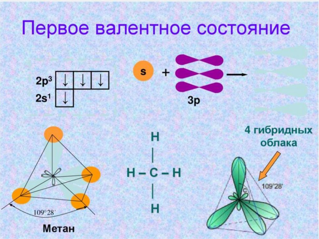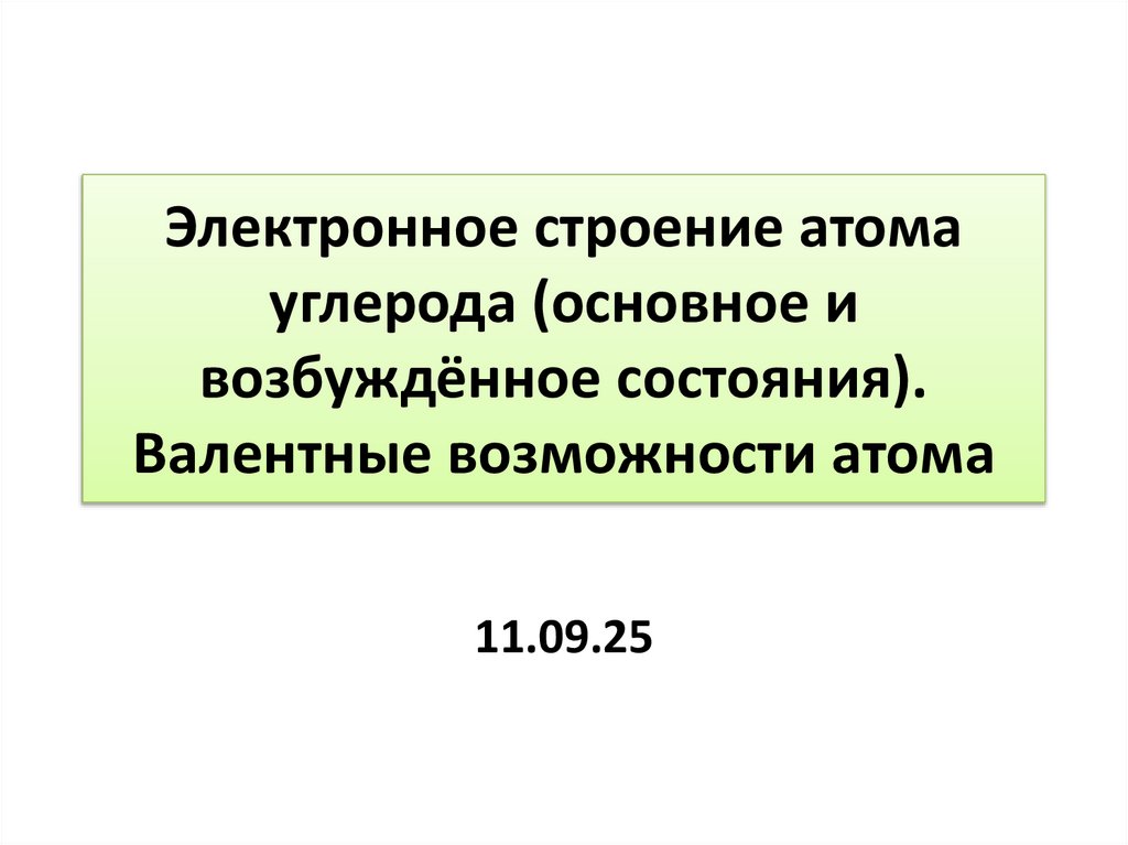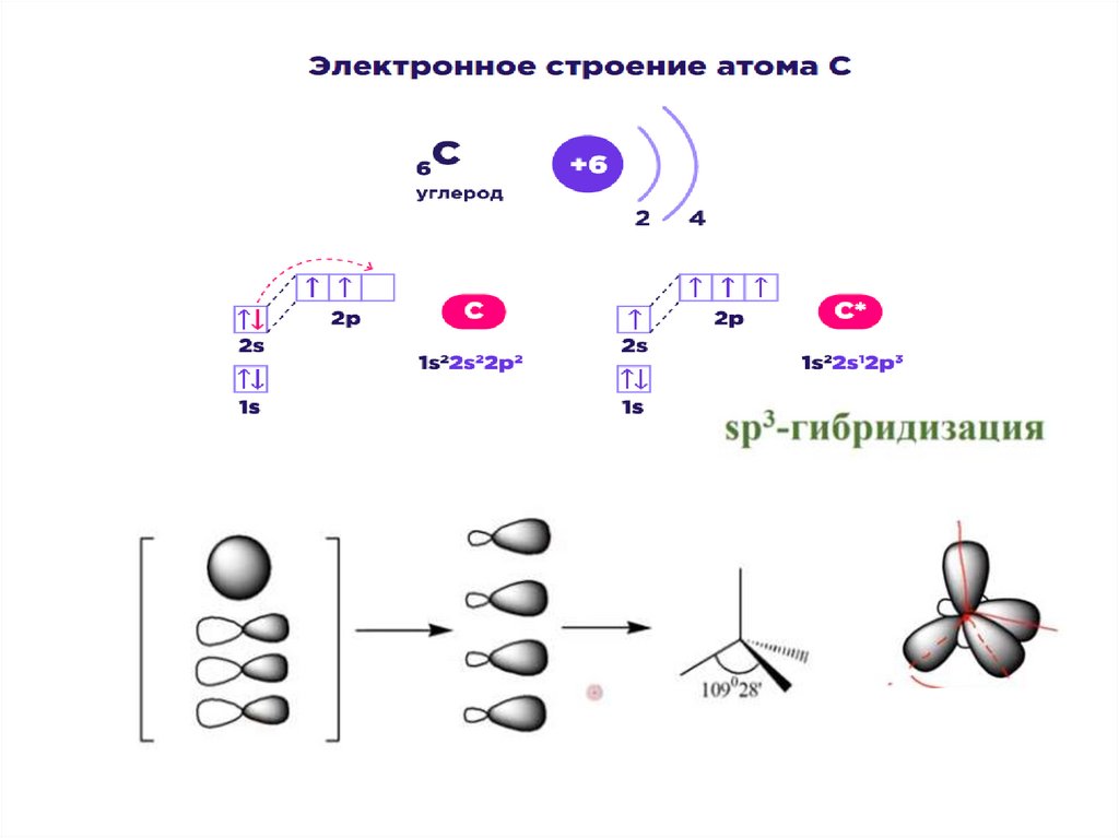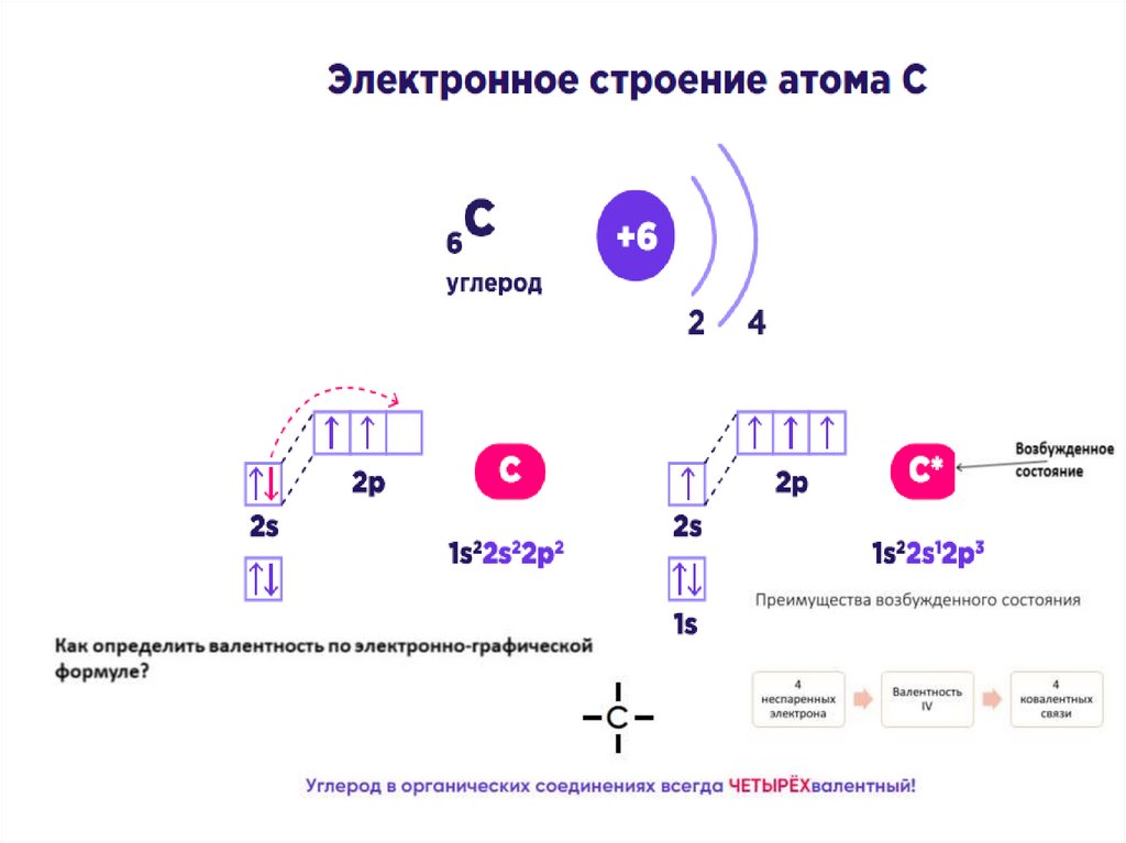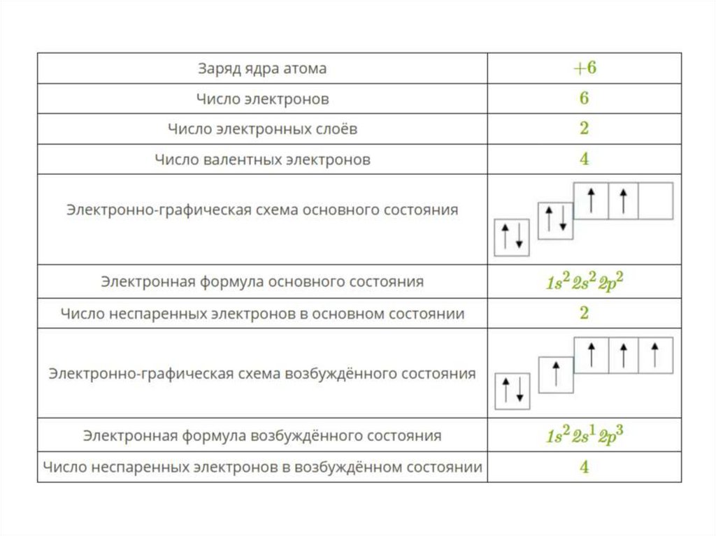 Электронное строение атома углерода (основное и возбуждённое состояния). Валентные возможности атома
