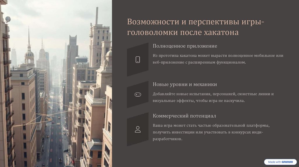 Возможности и перспективы игрыголоволомки после хакатонаПолноценное приложение