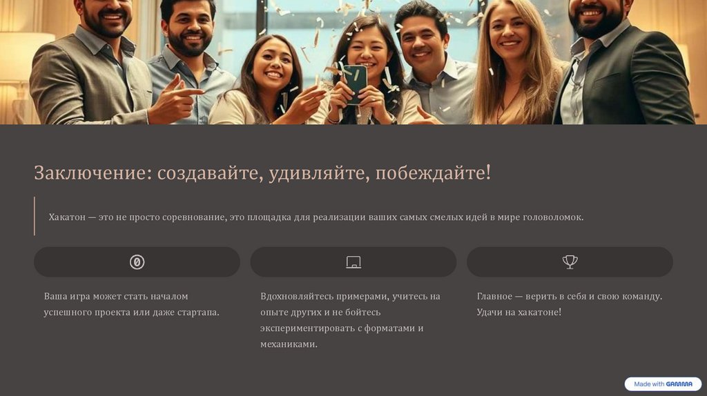 Заключение: создавайте, удивляйте, побеждайте!Хакатон — это не просто соревнование, это площадка для реализации ваших самых смелых идей в мире головоломок.