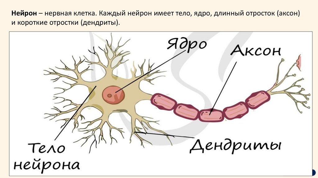 Нейрон – нервная клетка. Каждый нейрон имеет тело, ядро, длинный отросток (аксон)и короткие отростки (дендриты).