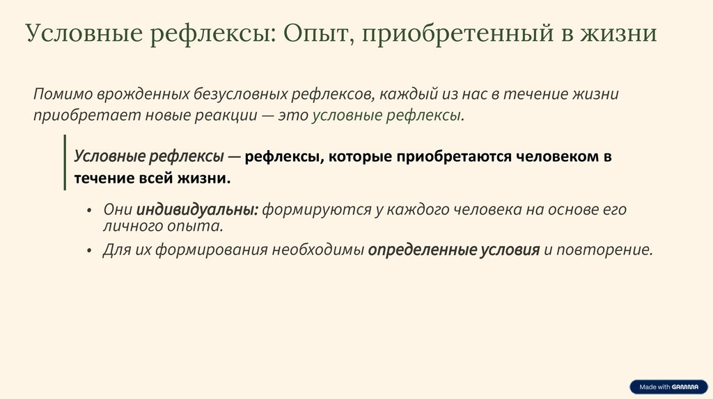 Условные рефлексы: Опыт, приобретенный в жизниПомимо врожденных безусловных рефлексов, каждый из нас в течение жизни