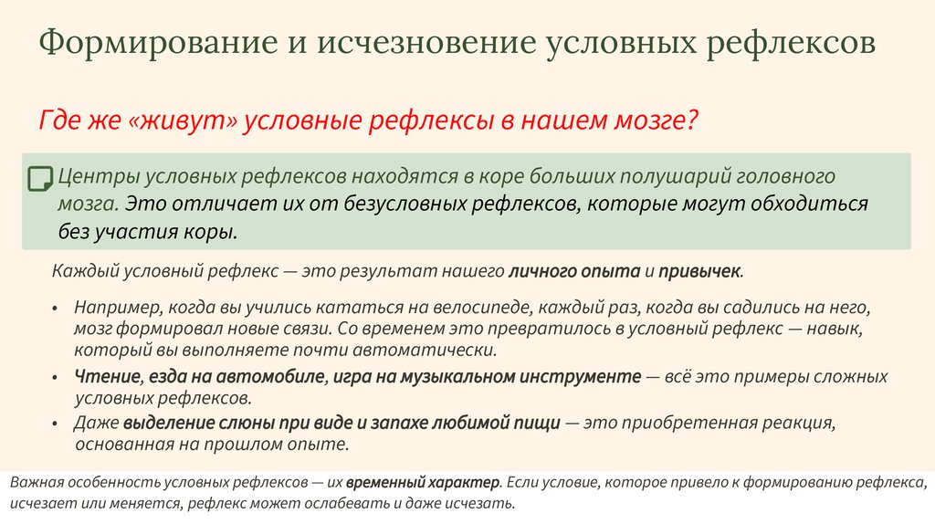 Важная особенность условных рефлексов — их временный характер. Если условие, которое привело к формированию рефлекса,