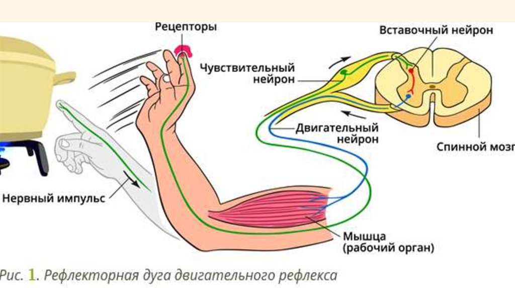 • Рефлекторная дуга — это путь, который нервный импульс проходит от момента возникновения