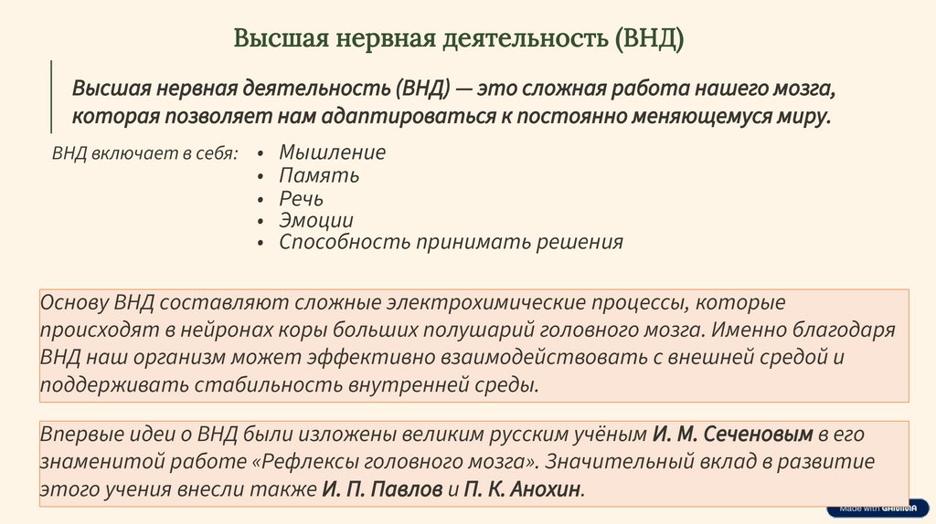 Высшая нервная деятельность (ВНД)Высшая нервная деятельность (ВНД) — это сложная работа нашего мозга,