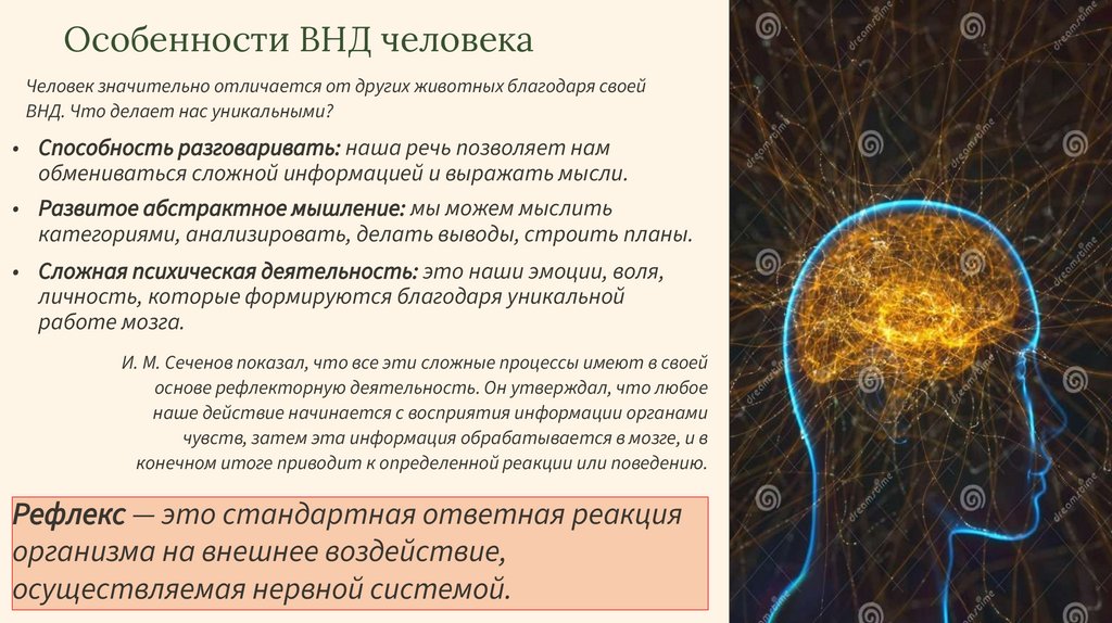 Особенности ВНД человекаЧеловек значительно отличается от других животных благодаря своей