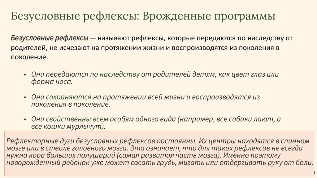 Безусловные рефлексы: Врожденные программыБезусловные рефлексы — называют рефлексы, которые передаются по наследству от