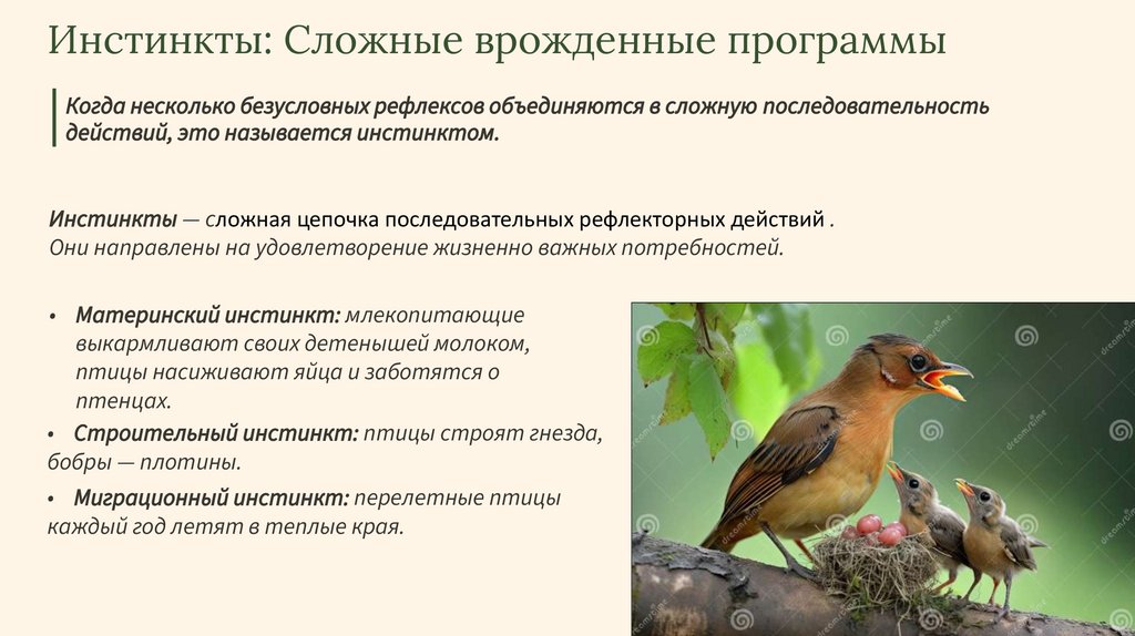 Инстинкты: Сложные врожденные программыКогда несколько безусловных рефлексов объединяются в сложную последовательность