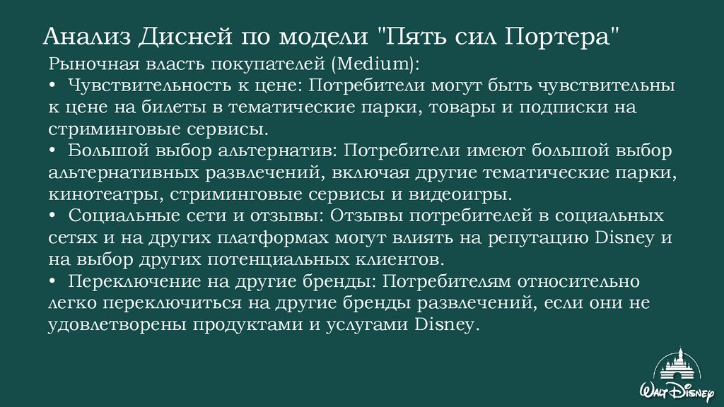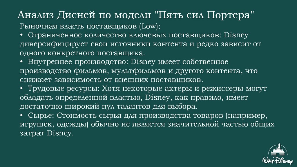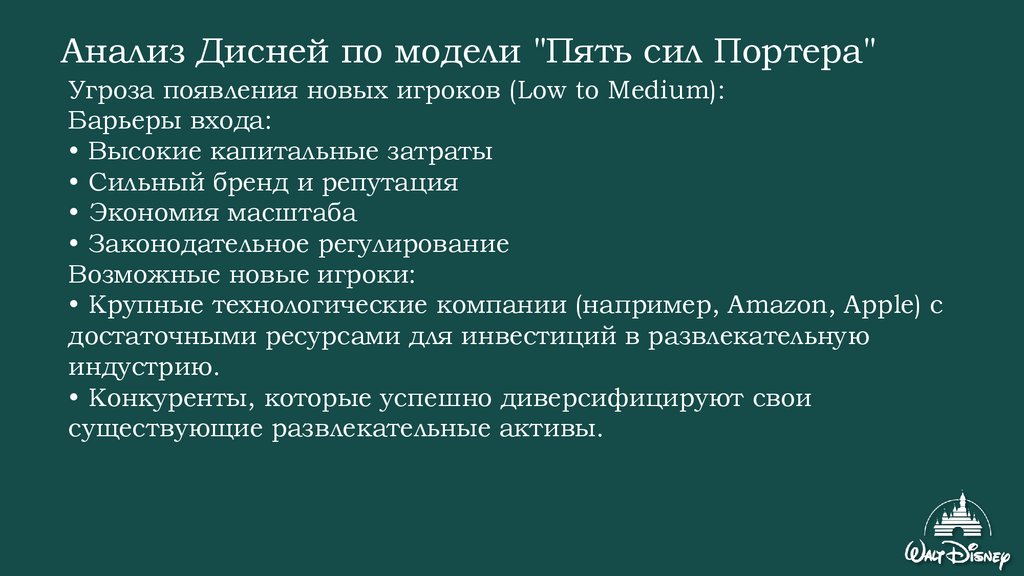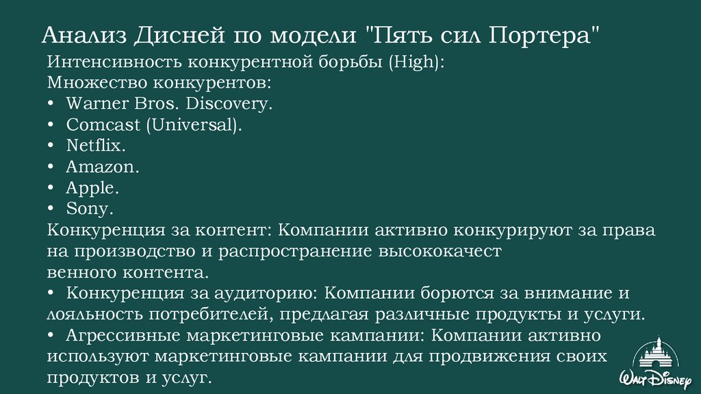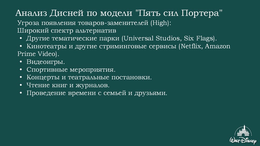 Анализ Дисней по модели "Пять сил Портера"Интенсивность конкурентной борьбы (High):