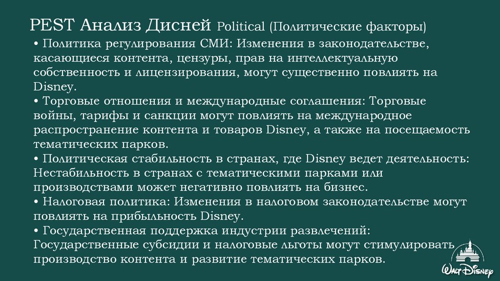 PEST Анализ Дисней Political (Политические факторы)• Политика регулирования СМИ: Изменения в законодательстве,