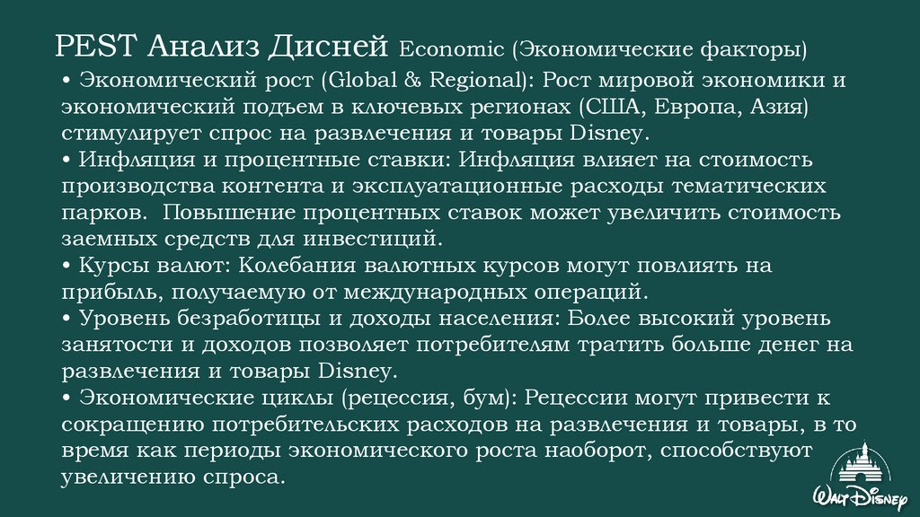 PEST Анализ Дисней Economic (Экономические факторы)• Экономический рост (Global & Regional): Рост мировой экономики и