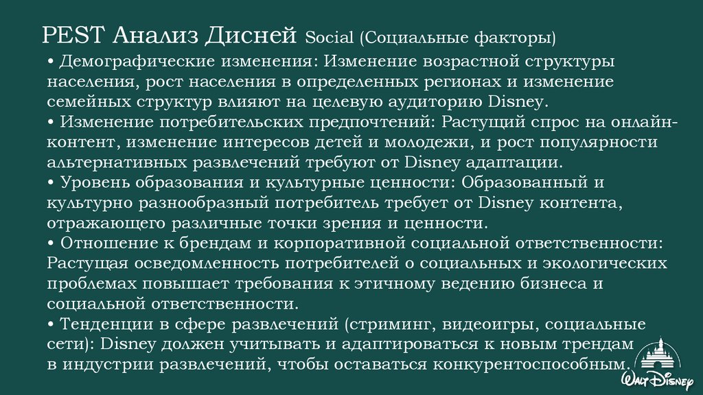 PEST Анализ Дисней Social (Социальные факторы)• Демографические изменения: Изменение возрастной структуры