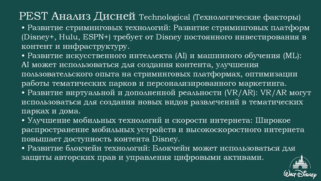 PEST Анализ Дисней Technological (Технологические факторы)• Развитие стриминговых технологий: Развитие стриминговых платформ