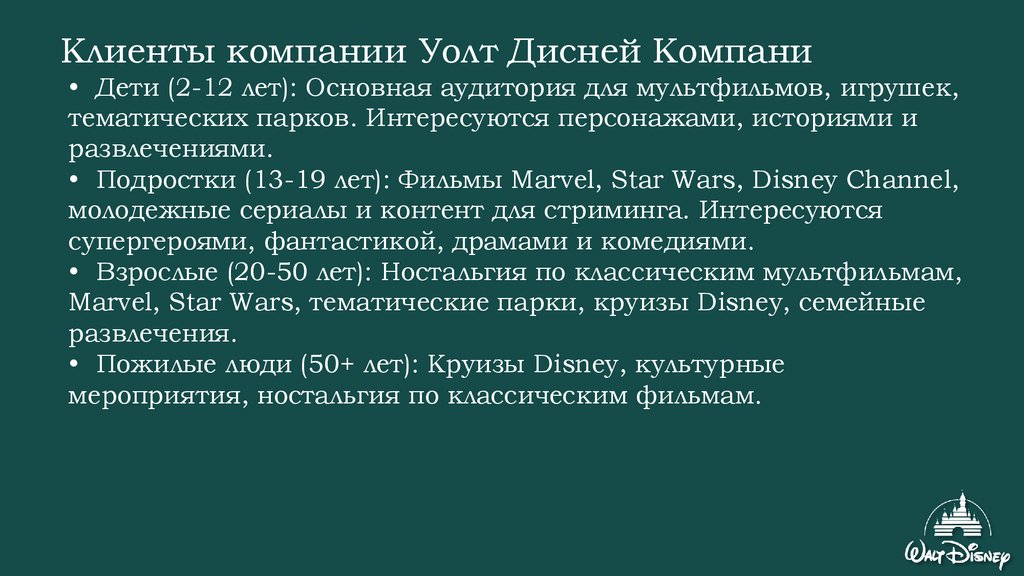 Клиенты компании Уолт Дисней Компани• Дети (2-12 лет): Основная аудитория для мультфильмов, игрушек,