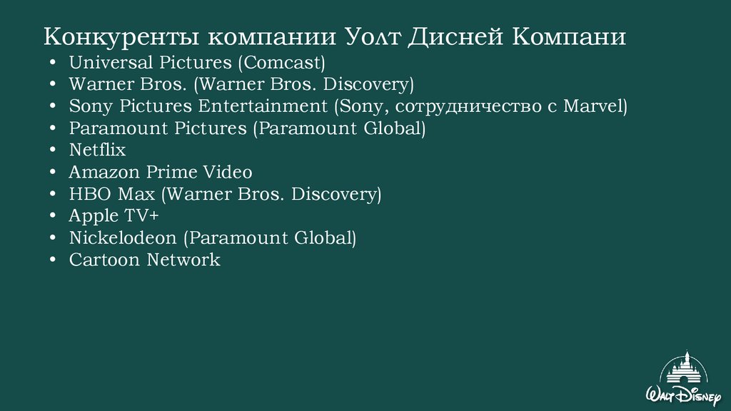 Конкуренты компании Уолт Дисней Компани• Universal Pictures (Comcast)
