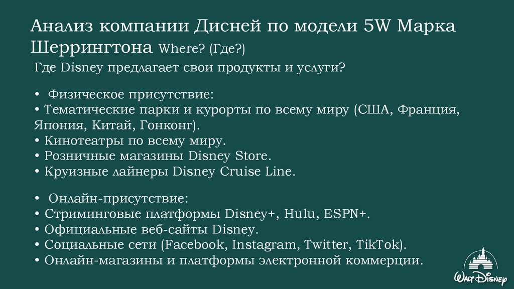 Анализ компании Дисней по модели 5W МаркаШеррингтона Where? (Где?)
