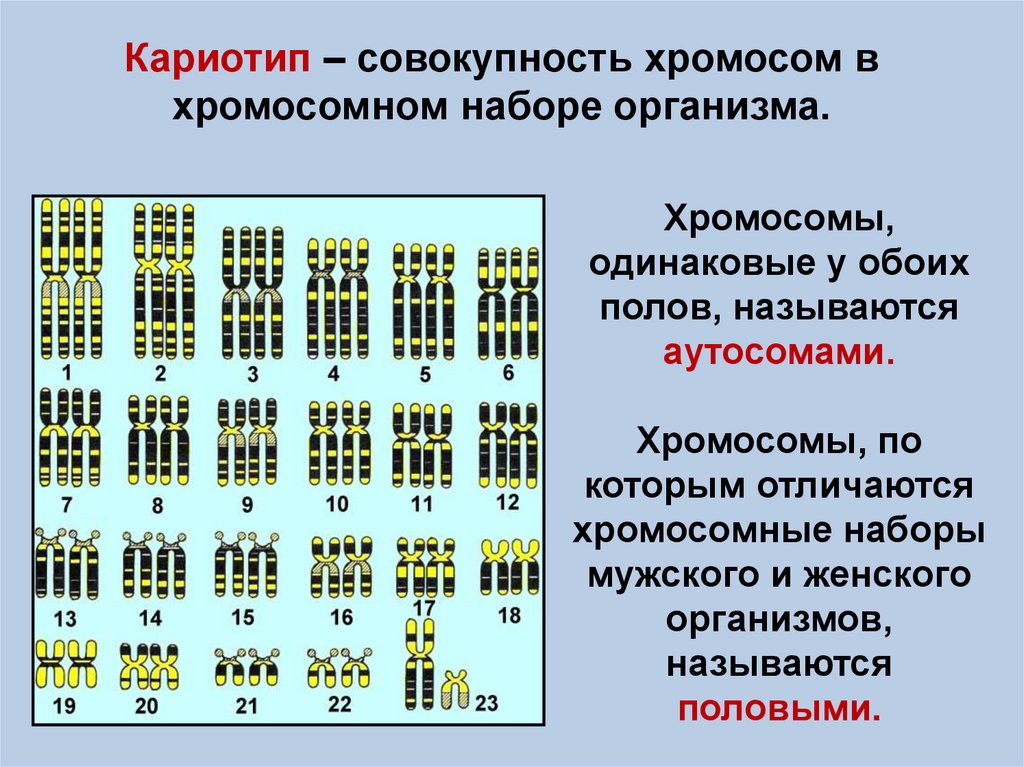 Кариотип – совокупность хромосом вхромосомном наборе организма.