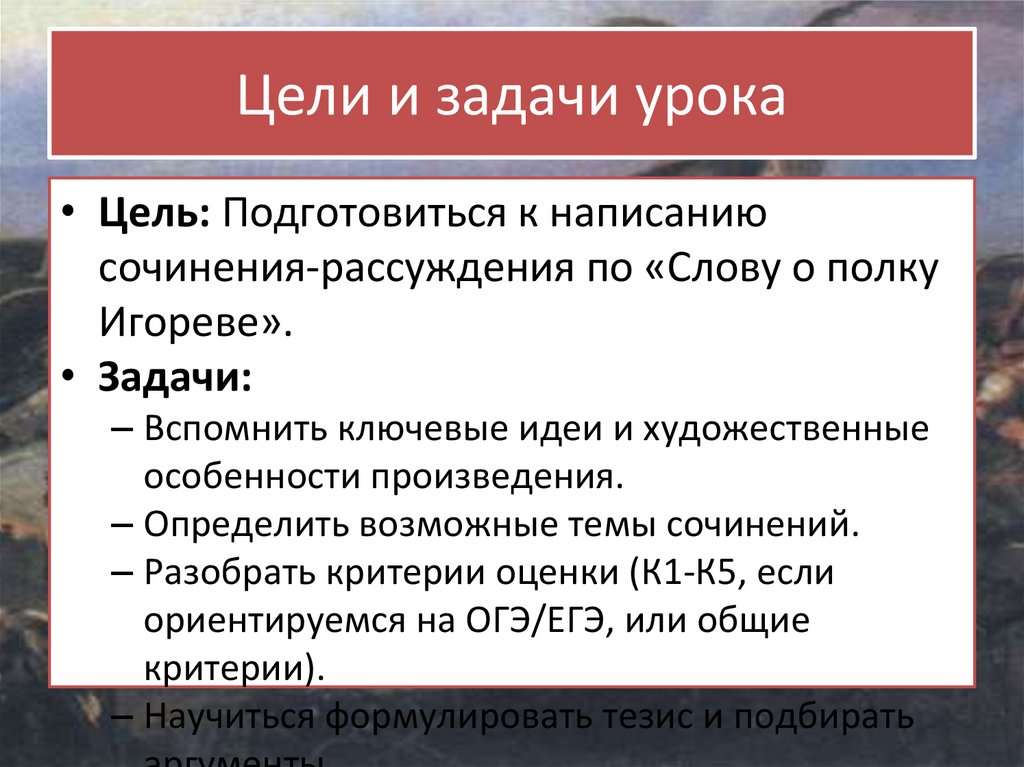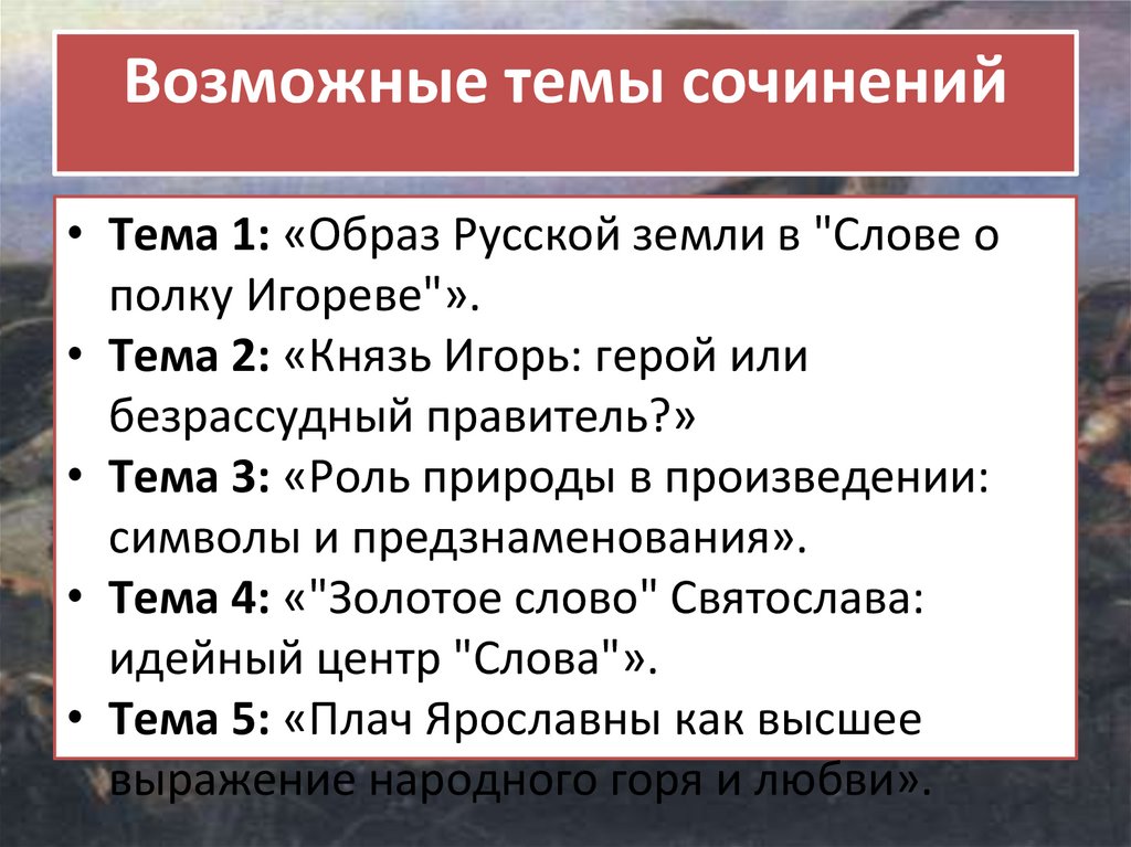 Возможные темы сочинений• Тема 1: «Образ Русской земли в "Слове о