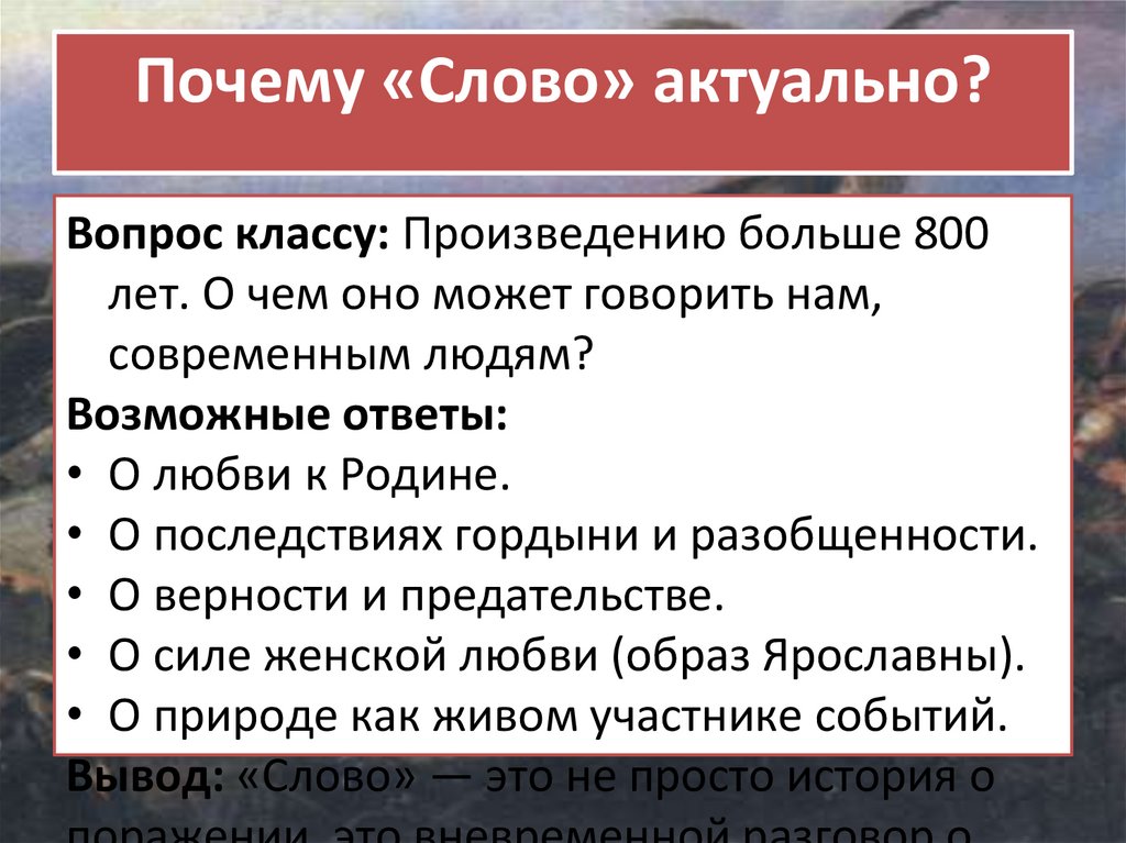 Почему «Слово» актуально?Вопрос классу: Произведению больше 800