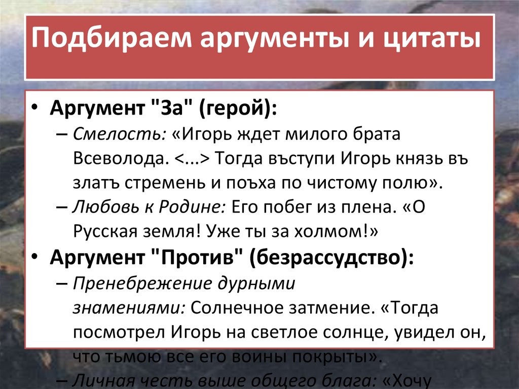 Подбираем аргументы и цитаты• Аргумент "За" (герой):
