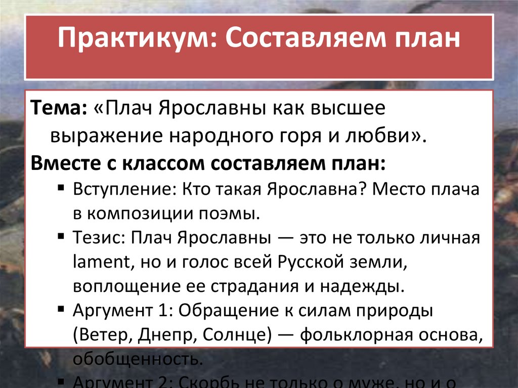 Практикум: Составляем планТема: «Плач Ярославны как высшее