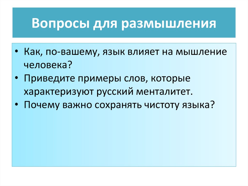 Вопросы для размышления• Как, по-вашему, язык влияет на мышление