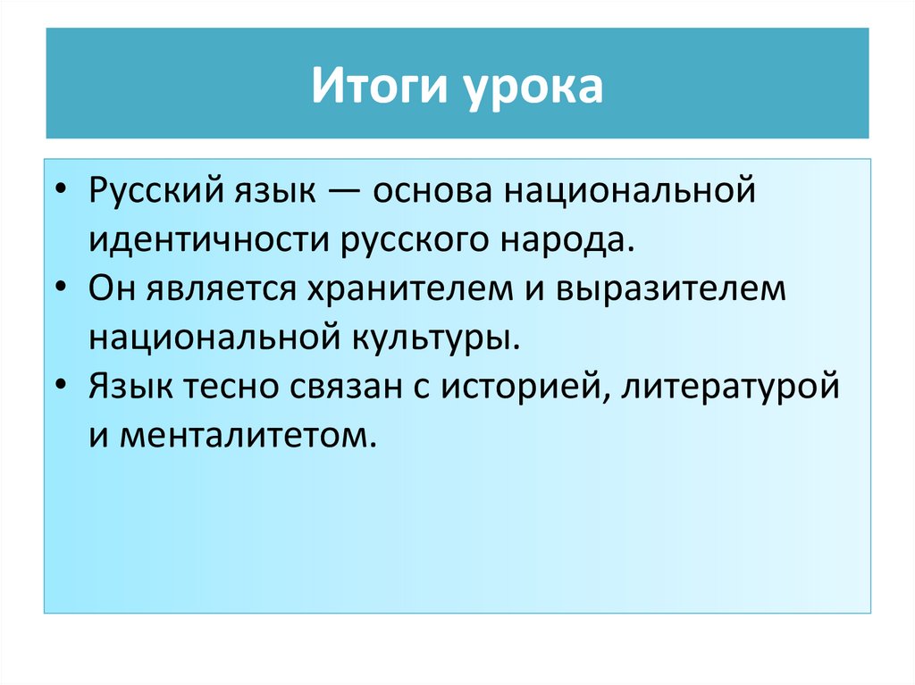 Итоги урока• Русский язык — основа национальной