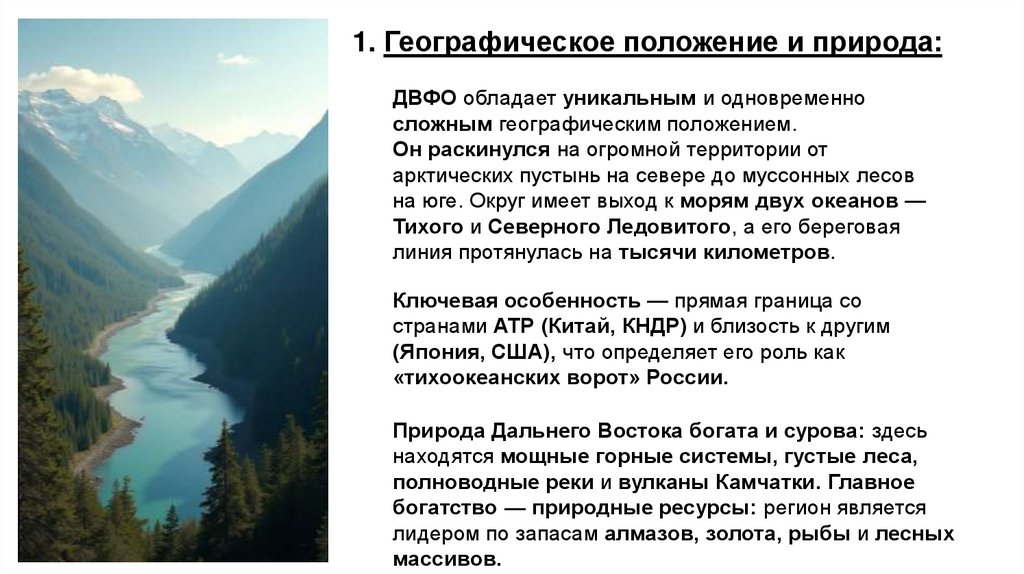 1. Географическое положение и природа:ДВФО обладает уникальным и одновременно