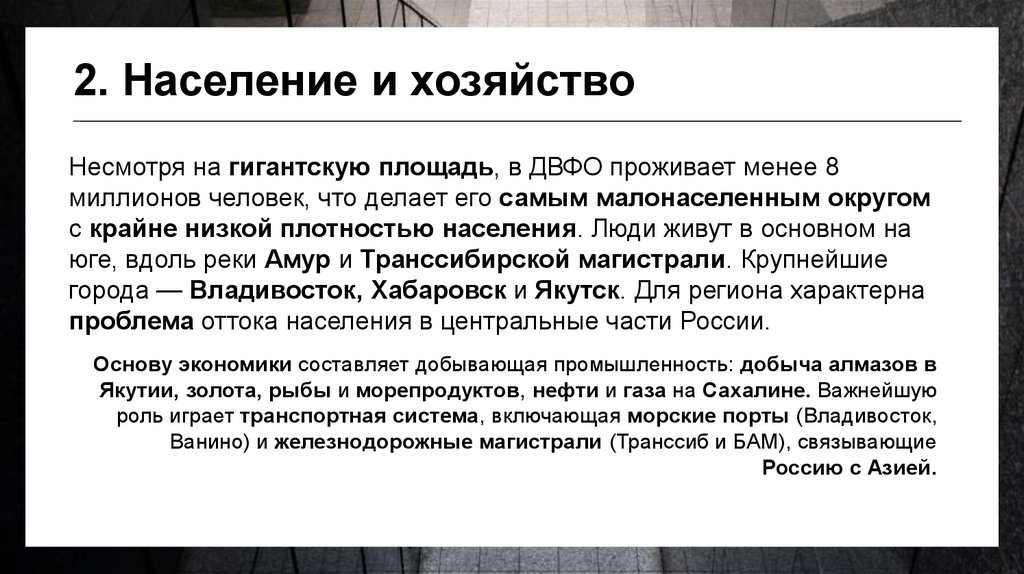 2. Население и хозяйствоНесмотря на гигантскую площадь, в ДВФО проживает менее 8