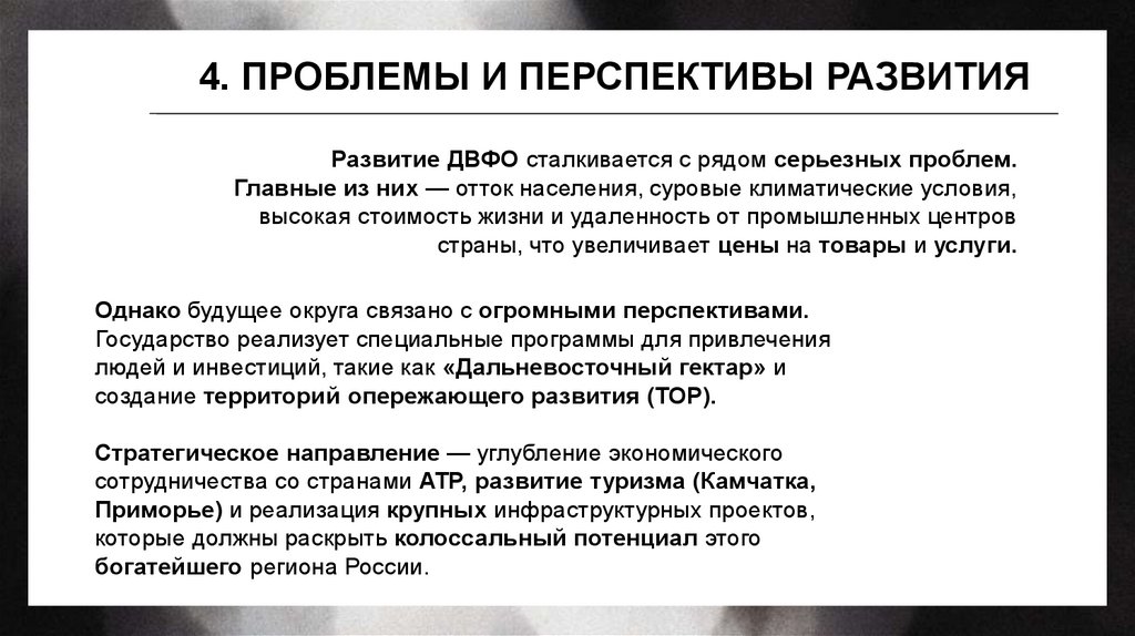 4. ПРОБЛЕМЫ И ПЕРСПЕКТИВЫ РАЗВИТИЯРазвитие ДВФО сталкивается с рядом серьезных проблем.