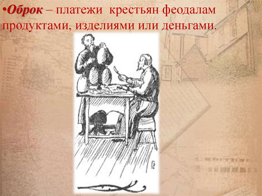 •Оброк – платежи крестьян феодалампродуктами, изделиями или деньгами.