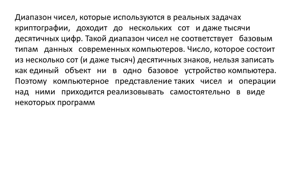 Диапазон чисел, которые используются в реальных задачахкриптографии, доходит до нескольких сот и даже тысячи