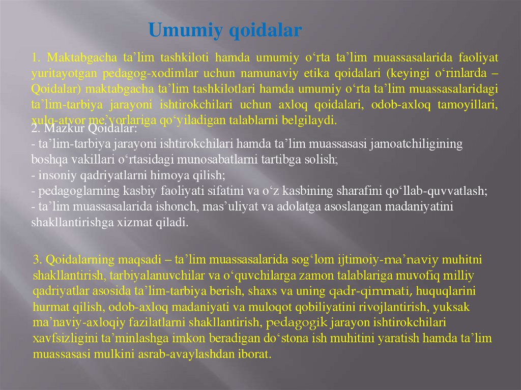 1. Umumiy oʻrta taʼlim muassasasining takomillashtirilgan namunaviy odob-axloq qoidalari(keyingi oʻrinlarda – Qoidalar) umumiy oʻrta taʼlim muassasasi ta’lim-tarbiya jarayoni