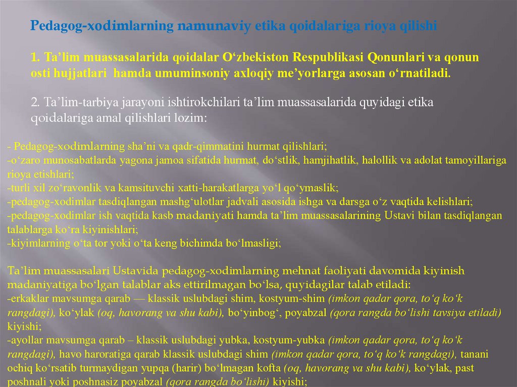 Pedagog-xodimlarning namunaviy etika qoidalariga rioya qilishi1. Ta’lim muassasalarida qoidalar Oʻzbekiston Respublikasi Qonunlari va qonun