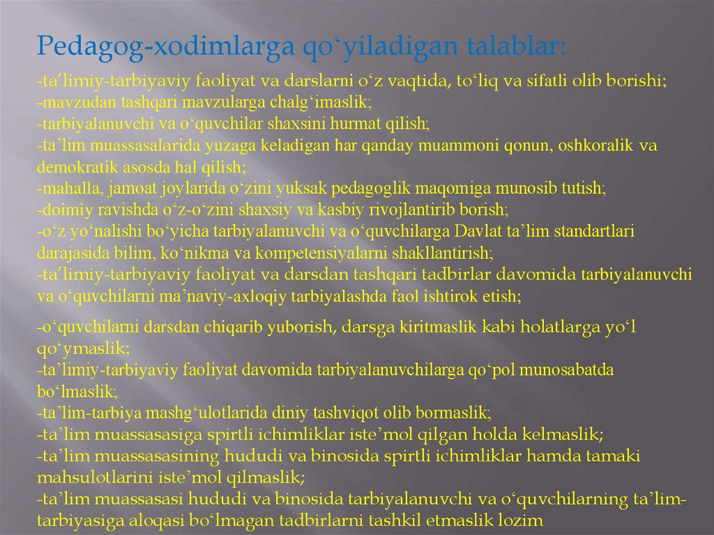 Pedagog-xodimlarga qoʻyiladigan talablar:-ta’limiy-tarbiyaviy faoliyat va darslarni oʻz vaqtida, toʻliq va sifatli olib borishi;