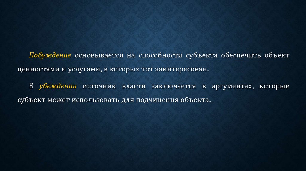Побуждение основывается на способности субъекта обеспечить объектценностями и услугами, в которых тот заинтересован.
