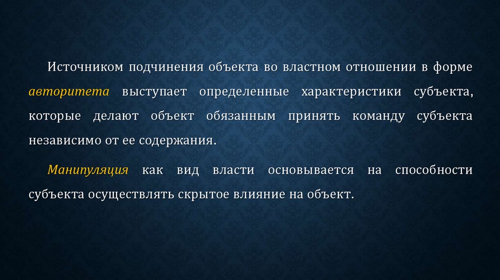 Источником подчинения объекта во властном отношении в формеавторитета выступает определенные характеристики субъекта,