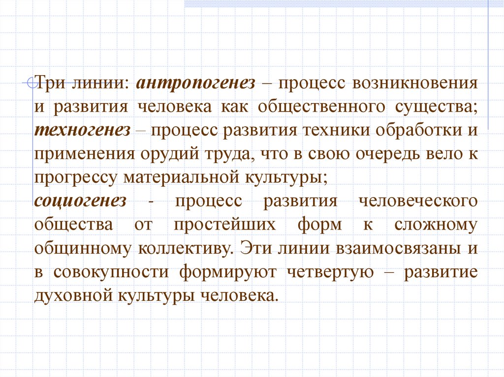 Три линии: антропогенез – процесс возникновенияи развития человека как общественного существа;