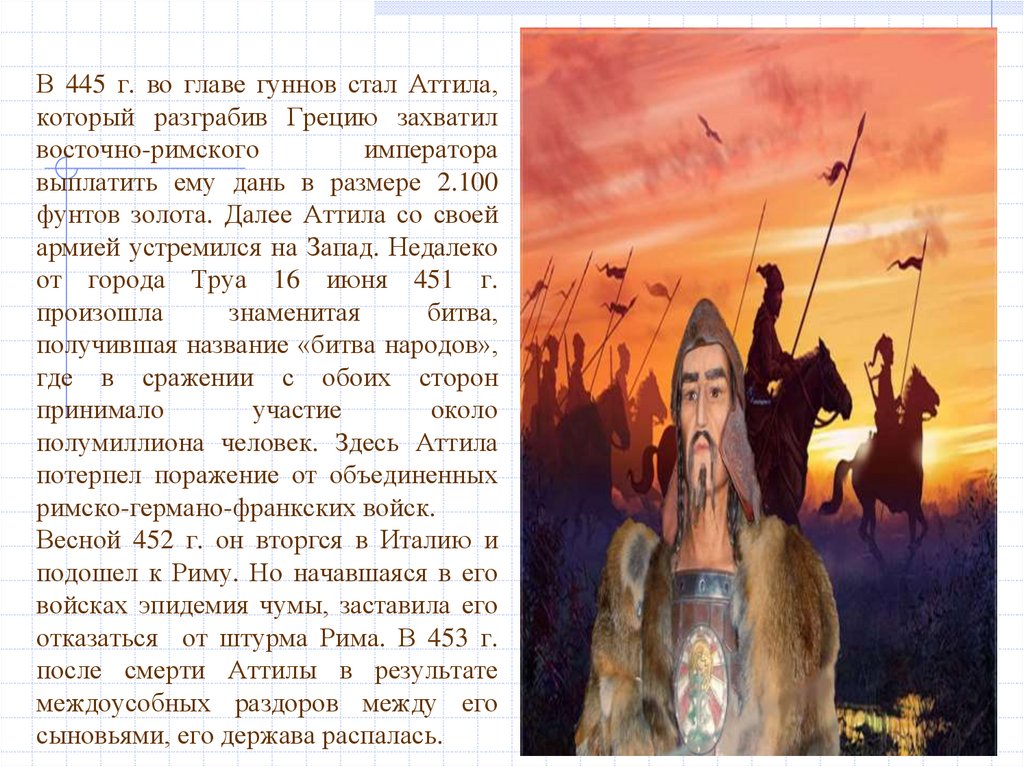В 445 г. во главе гуннов стал Аттила,который разграбив Грецию захватил