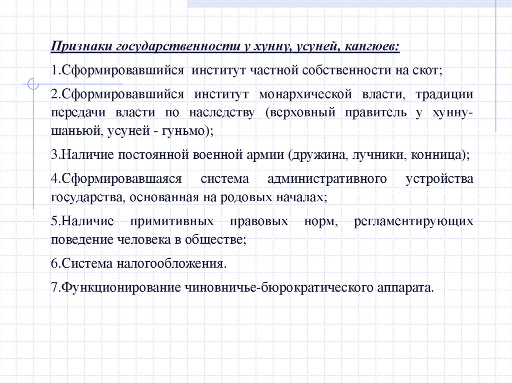 Признаки государственности у хунну, усуней, кангюев:1.Сформировавшийся институт частной собственности на скот;