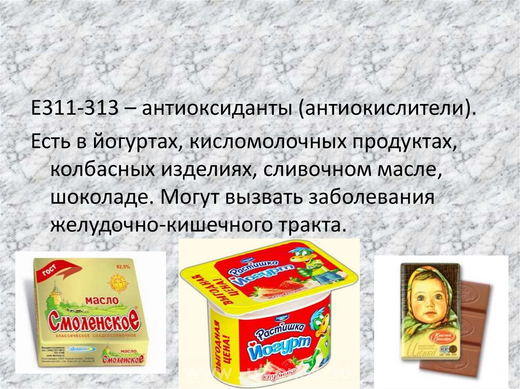 Е311-313 – антиоксиданты (антиокислители).Есть в йогуртах, кисломолочных продуктах,