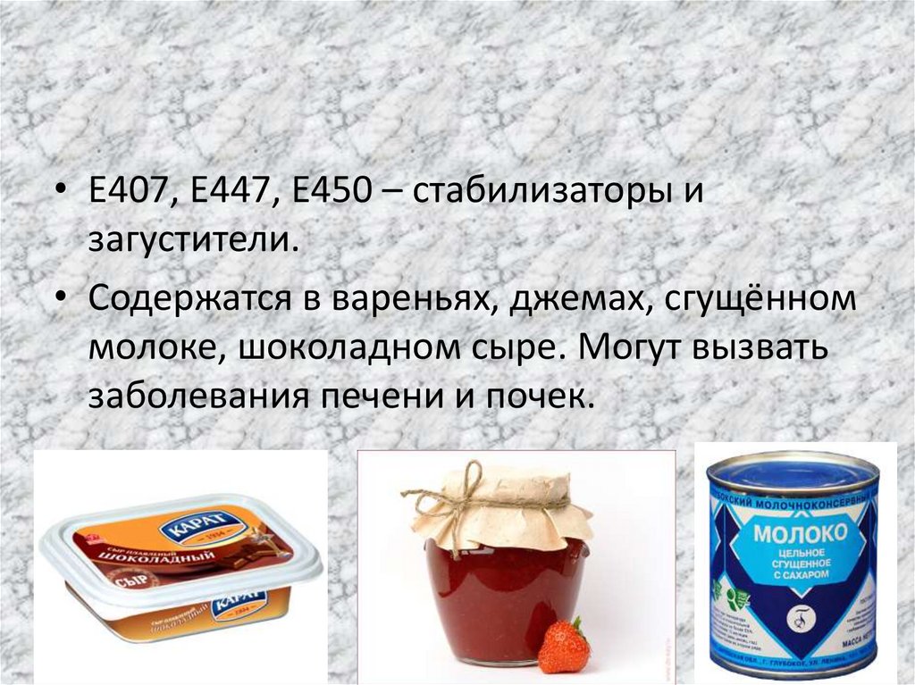 • Е407, Е447, Е450 – стабилизаторы изагустители.